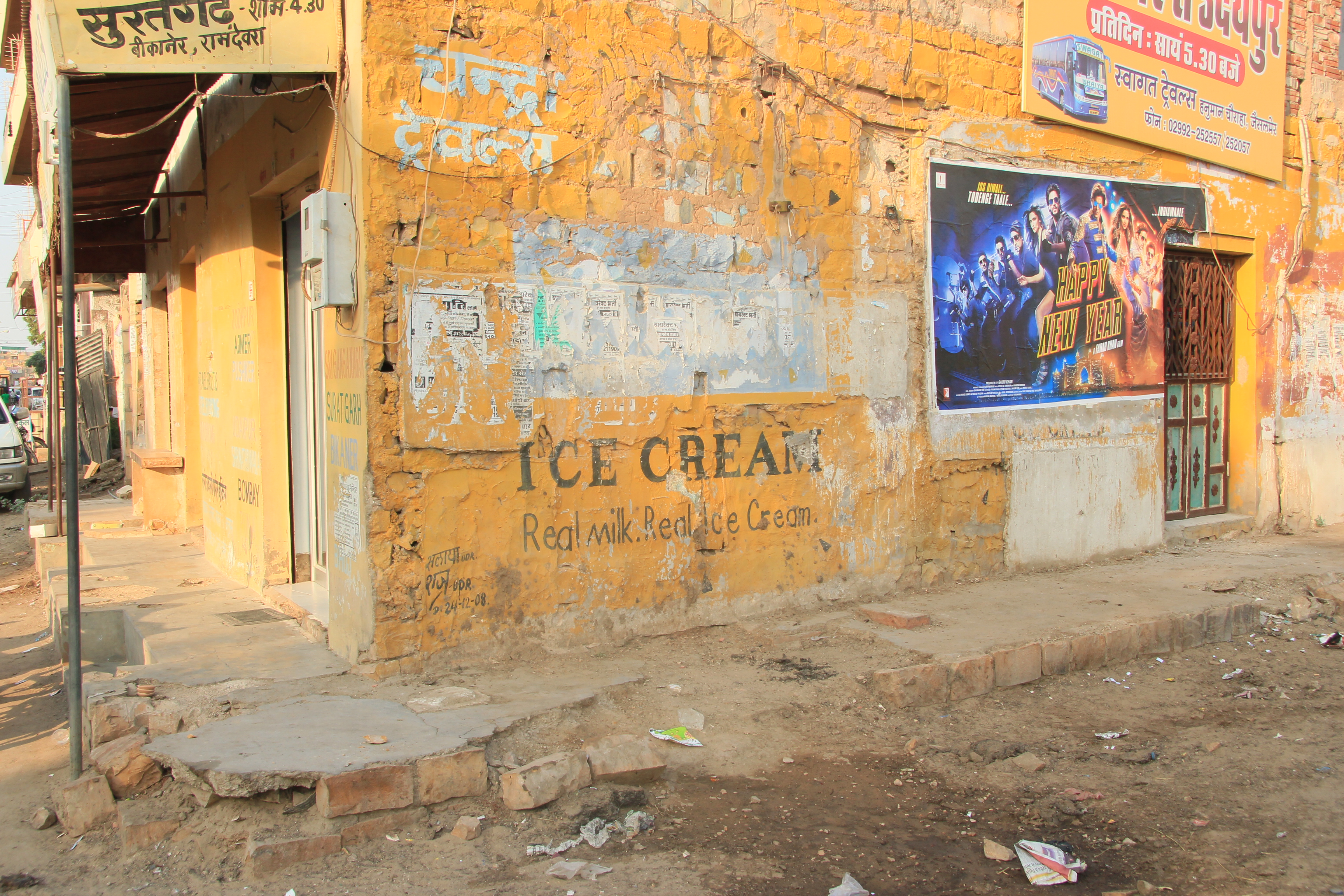 Les murs. Ils jouent plusieurs rôles. À Jodhpur, les murs des maisons ont été teints en bleu pour éloigner les moustiques. Dans les petits villages, les murs sont le moyen de distinguer une maison d’une autre. Fait plutôt frappant, les murs sont aussi des panneaux publicitaires.
